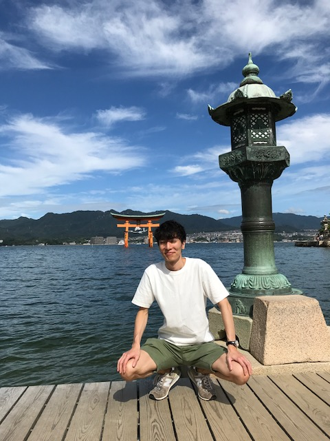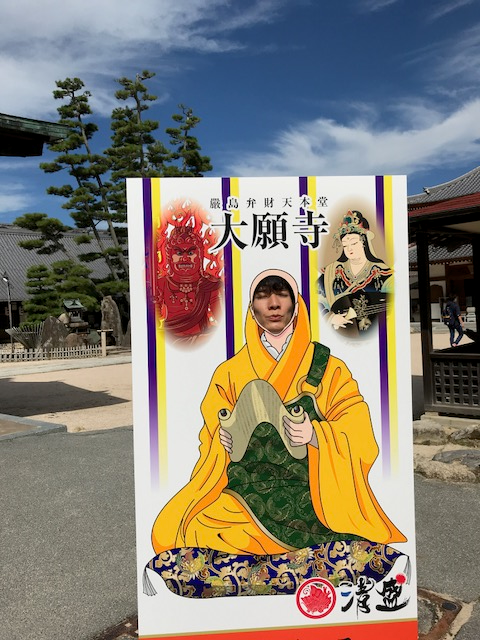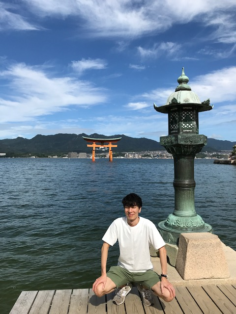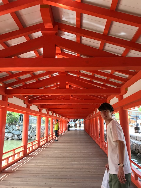 厳島神社をバックに爽やかさを出しながら写真を撮りましたが...