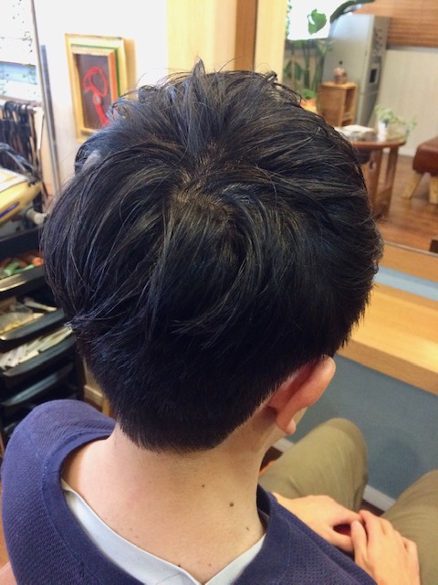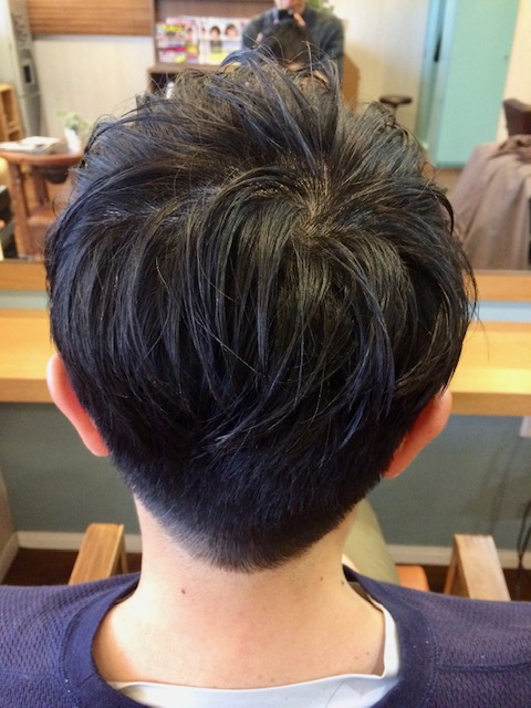 写真を見ていただくと分かると思いますが、耳上の髪が一番短いです。そこから前後に向かって少しづつ、長さを残してます。
